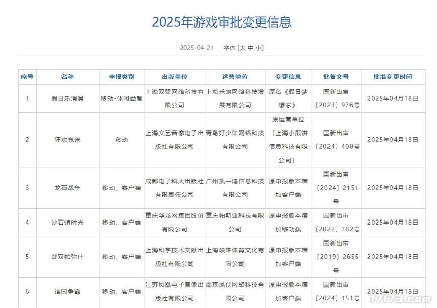 除此之外,在本次游戏版号相关信息中,还有6款游戏申请了审批信息变更,包括《战双帕弥什》《沙石镇时光》等。