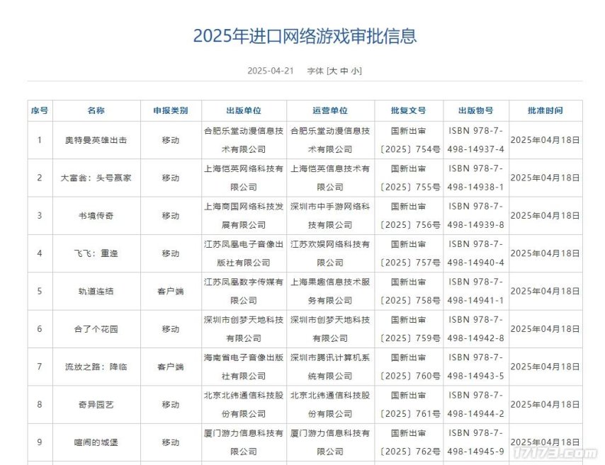 刚刚,4月游戏版号正式发放,总计118款国产游戏、9款进口游戏过审,其中有多款重点产品过审,包括腾讯《流放之路:降临》、网易雷火《极限战场》、恺英《大富翁:头号赢家》、深圳凉屋《魂坠深境》、上海久游《龙王大人》、深圳市迅雷网络《农场奇缘》、游艺春秋《时光特攻队》等。