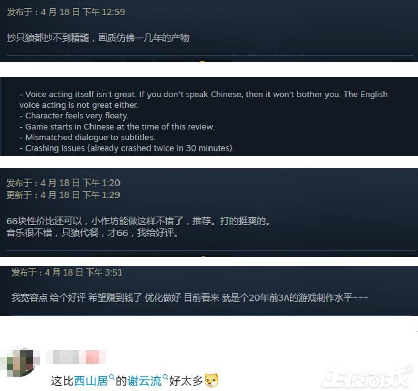 有玩家吐槽,抄《只狼》都抄不到精髓,画质仿佛十年前的产物。还有老外吐槽,游戏人物漂移,字幕和台词对不上,半小时游戏就崩溃了两次。