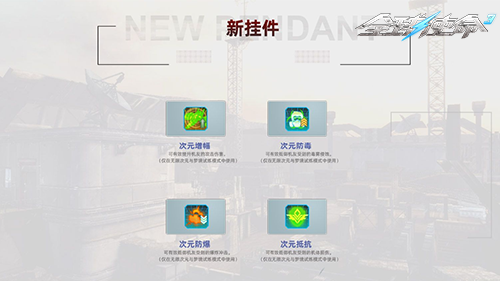 专为无限次元与梦境试炼模式研制的四款机友芯片(次元增幅、次元防毒、次元防爆、次元抵抗),能够有效增加无限次元与梦境试炼模式中机友的各项属性。次元增幅能大幅提升机友攻击伤害;次元防毒可抵御毒雾侵蚀;次元防爆能保护机友免受爆炸冲击;次元抵抗能增强机友机体防护能力。相信有了这些插件加持,你的机友将变得坚不可摧。