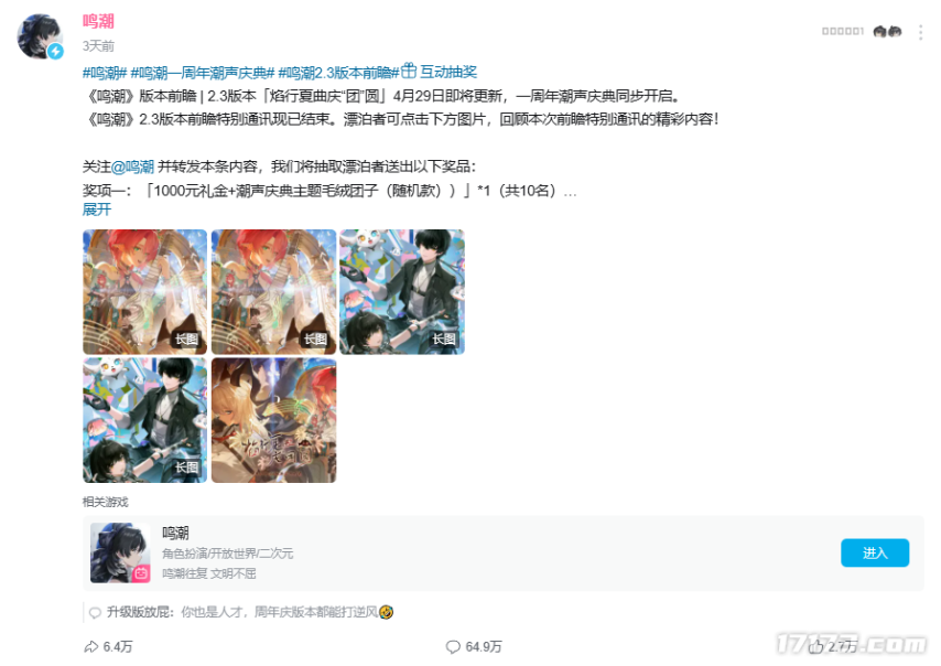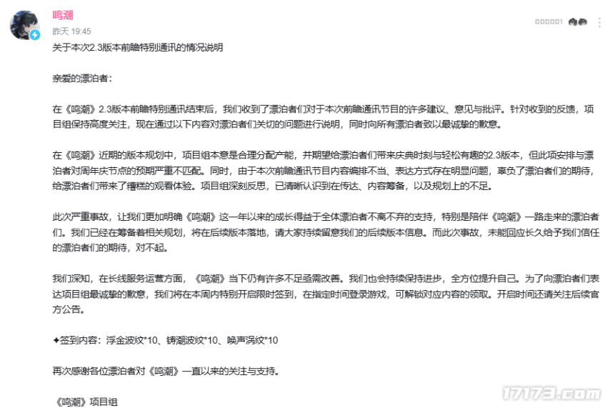 万万没想到,这逆风局来的如此之快。在上周六,《鸣潮》举行了2.3版本周年庆前瞻直播,项目组原本打算通过此次直播给玩家带来惊喜。然而,实际情况却与预期大相径庭,由于福利不如预期以及运营上的多个失误,导致玩家感到失望,进而引发了一系列争议。