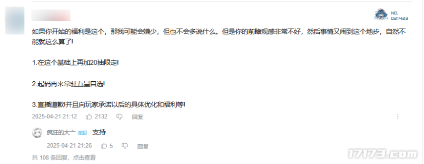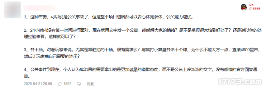 对于这些补偿内容,玩家也在评论区表达了自己的看法。不少玩家认为目前的补偿力度不够,还有玩家认为态度不够诚恳,希望项目组再开一次直播对此次事件进行回应,而不是公告上冷冰冰的文字。
