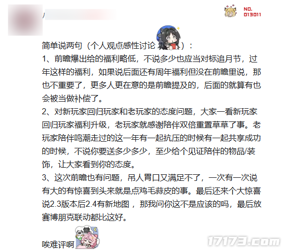 首先是本次周年庆版本在福利方面远低于玩家的预期。毕竟之前的追月节都送了个强度不错的相里要,周年庆反而平平无奇。