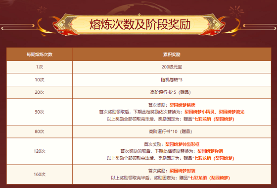 与此同时,每期熔丹达到相应次数可以累积开启不同的阶段累积赠礼,累积熔炼次数越多,奖励越丰厚!梨园绮梦套装、铭牌、小精灵、流光、帅盔彩框、称谓系列装扮送不停!