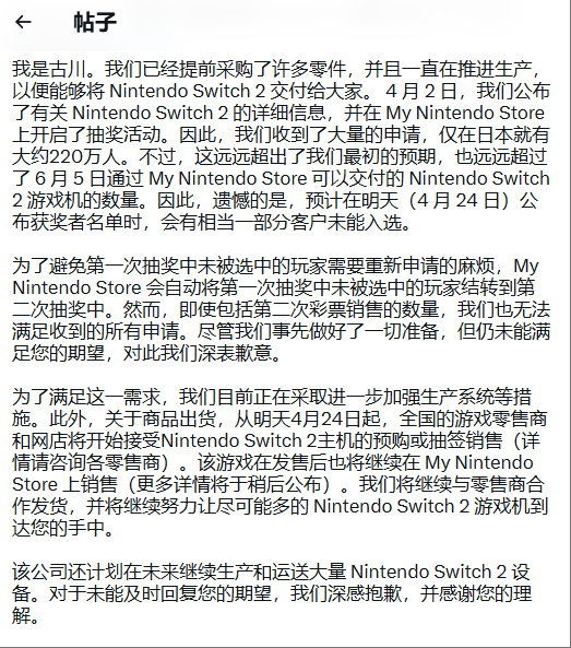 同时,古川表示已经开始加大整个Switch2的生产,将继续努力把游戏机送到顾客的手上。Switch2