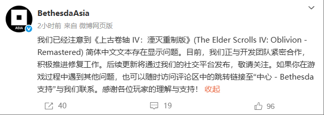 我们已经注意到《上古卷轴 IV:湮灭重制版》(The Elder Scrolls IV: Oblivion - Remastered) 简体中文文本存在显示问题。目前,我们正与开发团队紧密合作,积极推进修复工作。后续更新将通过我们的社交平台发布,敬请关注。如果你在游戏过程中遇到其他问题,也可以随时访问评论区中的跳转链接至“中心 - Bethesda支持”与我们联系。感谢各位玩家的理解与支持!
