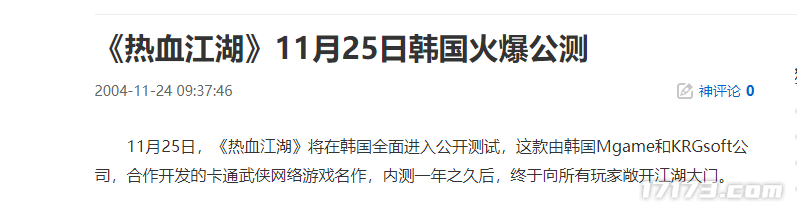 2005年3月4日,中华网在北京亮马饭店召开发布会,宣布对17game进行了3300万元人民币的战略性投资,持有了 36.5% 的股份,并斥300万美元巨资引进了韩国著名的网络游戏《热血江湖》。