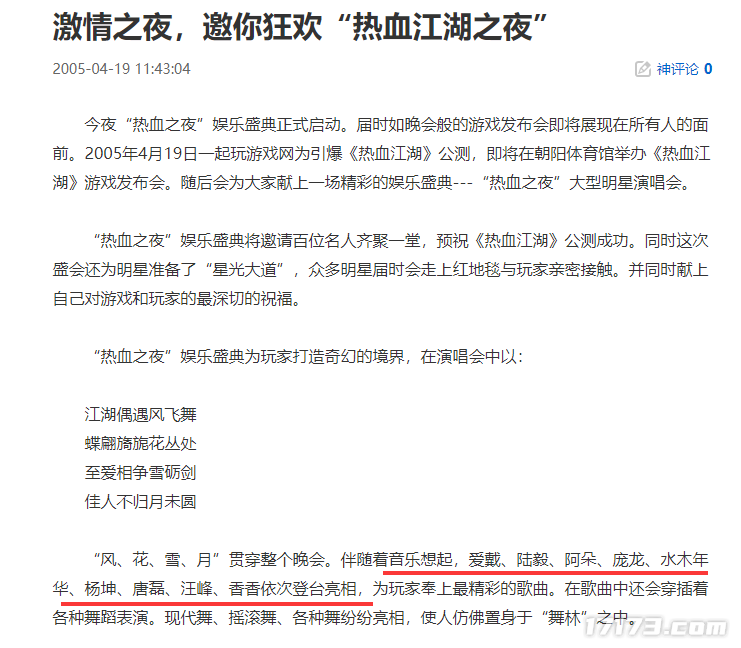 又过了一周(4月19日),在《热血江湖》公测前夕,17game耗费巨资举办全国公测娱乐盛典,邀请百位名人站台与玩家互动,预祝《热血江湖》公测成功。