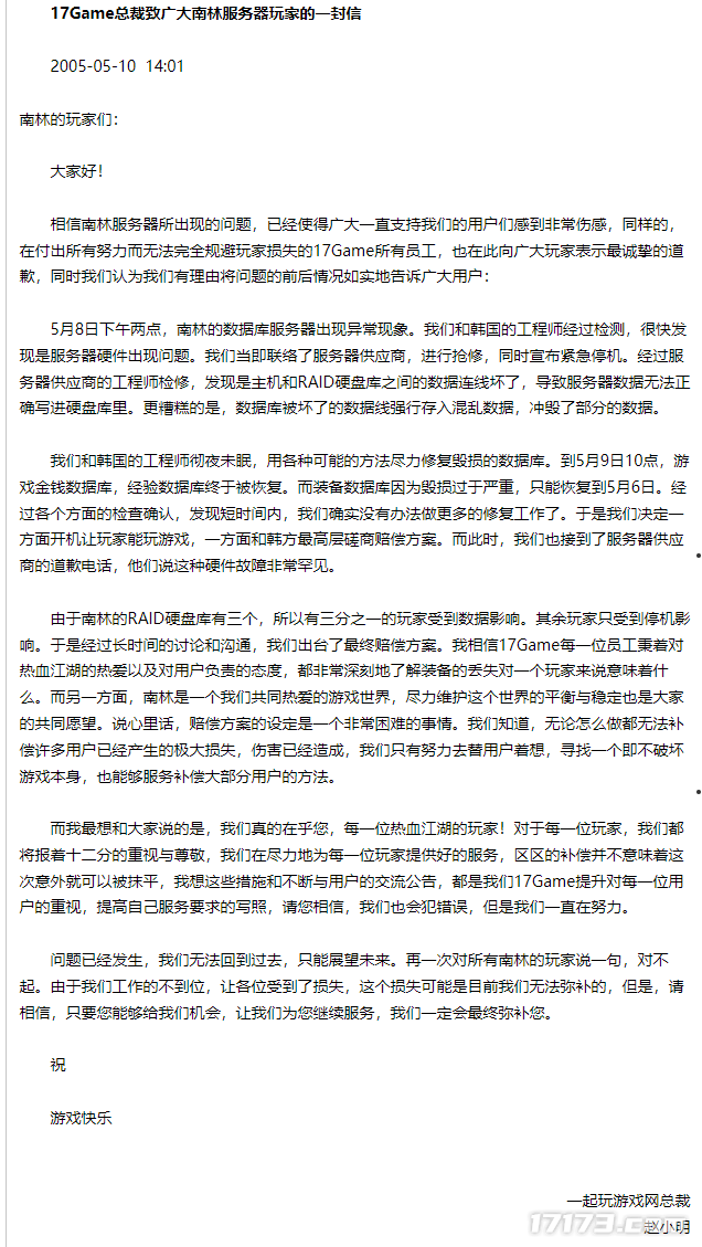 服务器出现问题,老板亲自写道歉信给全体玩家,言语诚恳,十分难得。