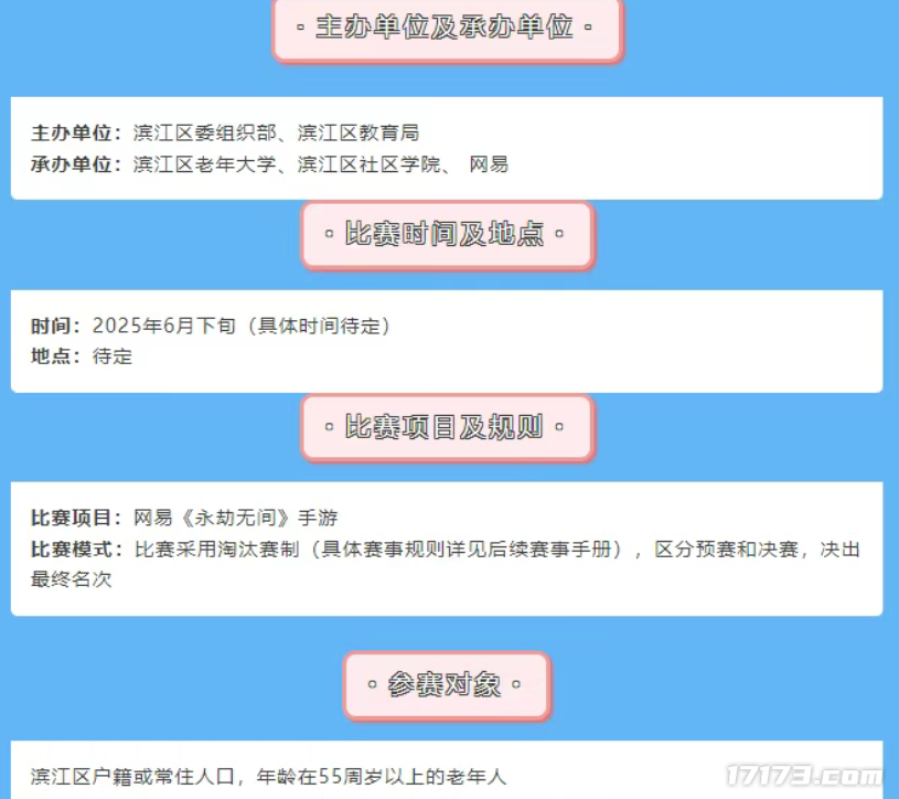4月22日,浙江省杭州市下属的“浦沿街道江南社区”社区公众号发布公告,宣布杭州市滨江区将于6月下旬举办一场老年电竞活动。该活动由江区委组织部、教育局主办,滨江区老年大学、社区学院和网易共同承办,召集55周岁以上的滨江区老年人报名参赛。
