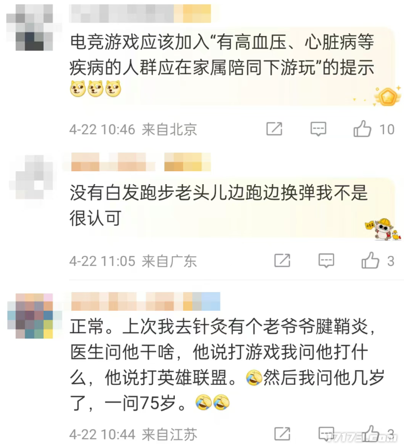 大家都觉得让55岁大爷大妈来打比赛这个形式,对于我们来说,还是太超前了,电竞游戏应该加入“有高血压、心脏病等疾病的人群应在家属陪同下游玩”的提示。
