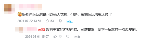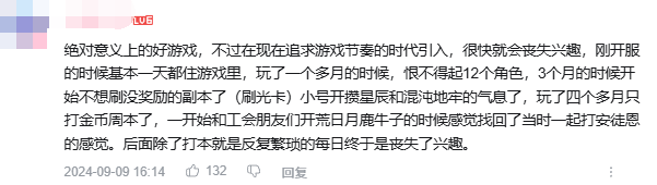 目前来说,国服为了追韩服进度,内容更新速度过快,很多人追不上节奏。但游戏本身又没有长期玩法支撑,到后期除了打本还是打本,不少玩家反馈每天刷地牢刷到吐,十分无聊。