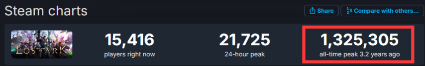 《命运方舟》是由《穿越火线》的开发商Smile Gate研发的俯视角MMORPG,早在2019年就已在韩国市场上线,后由亚马逊发行至欧美市场,上线一个月内玩家总数超过2000万,Steam最高同时在线达到过130多万,一度成为Steam历史上该项统计排名第二的游戏。