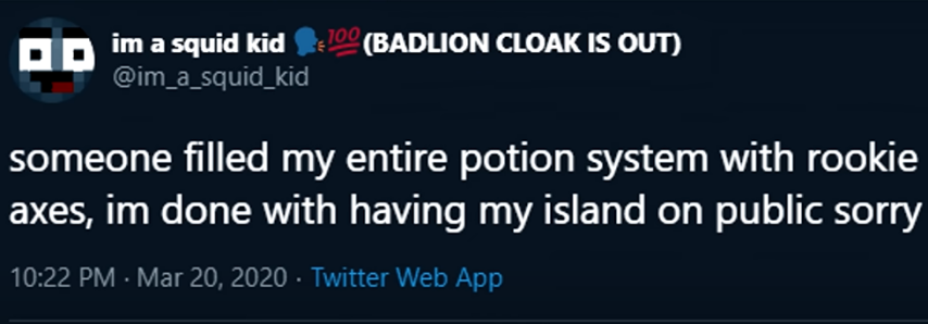 这个战术维持了一段时间,直至某天Squid突然把岛屿对外关闭,并且发动态说是因为“有人恶意整蛊了他,把他家的漏斗里塞满了难以删除的菜鸡斧”。