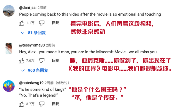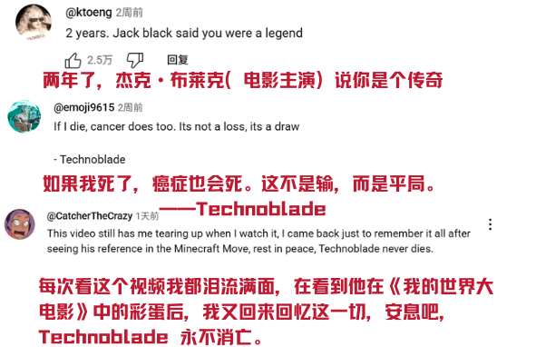 《我的世界大电影》播出后,Techno的粉丝自发回到曾经的Techno社群以及他的油管评论区悼念他。
