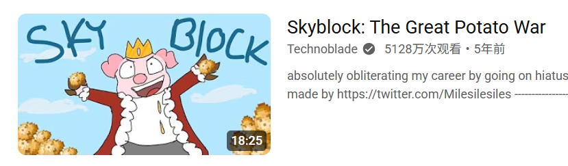 Techno的存在为《我的世界》增色了不少,而他最具代表性的两个系列大概就是“起床战争”和“土豆大战”,后者就是在“空岛生存”里发生的。