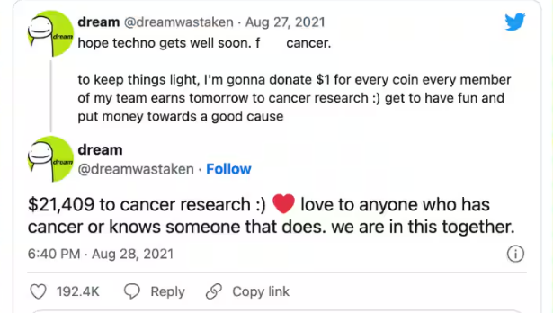当这个不幸的消息传来,Techno的游戏好友、另一位《我的世界》大神Dream向癌症研究捐款21,409美元。