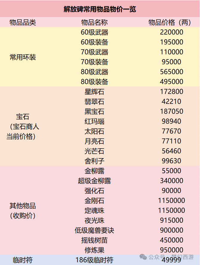 以下是东方明珠各种常用物品的价格汇总: