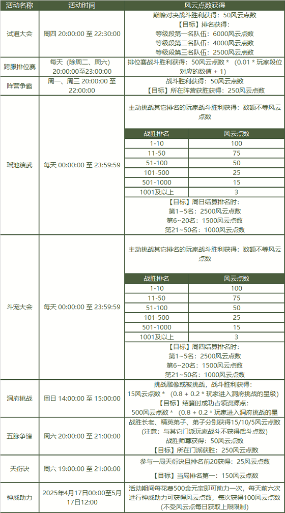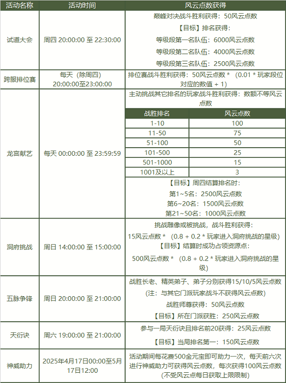 活动期间,普通版和经典版的玩家通过参与指定的活动就能获得风云点数。其中普通版所有区组,参与试道大会、跨服排位赛、阵营争霸、瑶池演武、斗宠大会、洞府挑战、五脉争锋、天衍诀以及神威助力活动;经典版所有区组,参与试道大会、跨服排位赛、龙宫献艺、洞府挑战、五脉争锋、天衍诀、神威助力活动,均设有相应的风云点数奖励机制。
