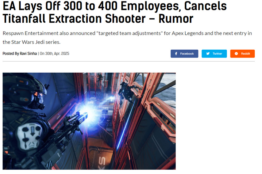 此次裁员导致了重生娱乐的两款项目被取消,其中一款是全新的《泰坦陨落》系列游戏。该作内部代号为“R7”,是一款以《泰坦陨落》宇宙为背景的射击游戏,这也是 EA 近年来取消的第二个《泰坦陨落》相关项目。另一款名为《泰坦陨落 传奇》的《APEX》×《泰坦陨落》联动游戏也已取消。