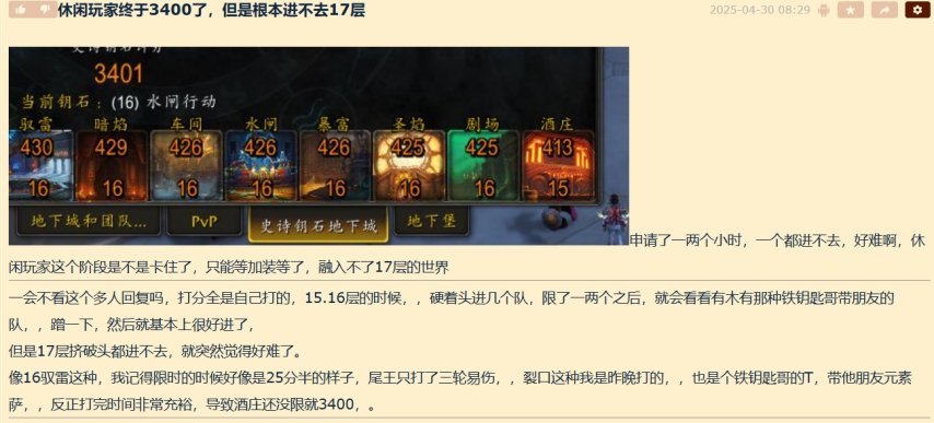 今早(4月30日)一位《魔兽世界》玩家在论坛发表了一篇帖子,以称自己是“休闲玩家”并附带大秘境高层战绩。