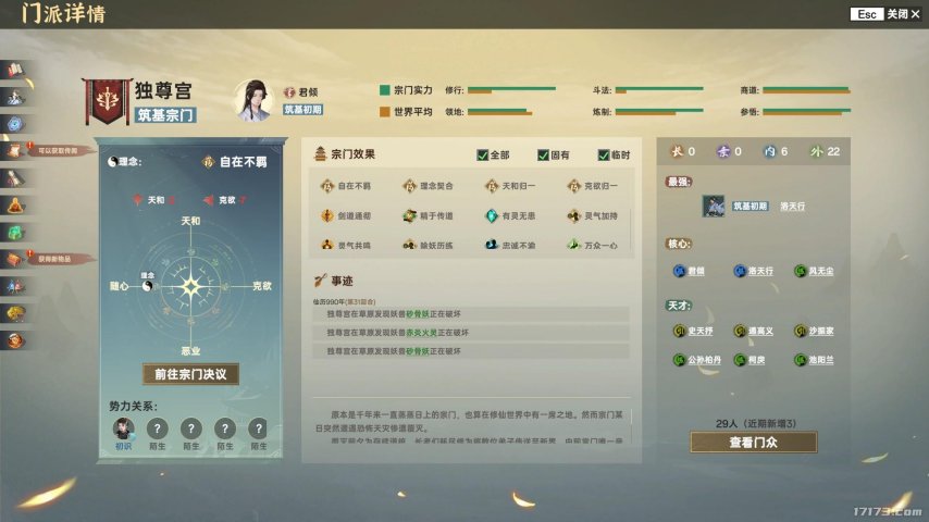 《宗门志》是一款属于修仙人的4X游戏。玩家将在宗门遭遇灭顶之灾的危难之际扮演新任掌门,带领众人在时空通道另一端的新世界当中,凝神魂、结金丹,化神登仙,重铸宗门。