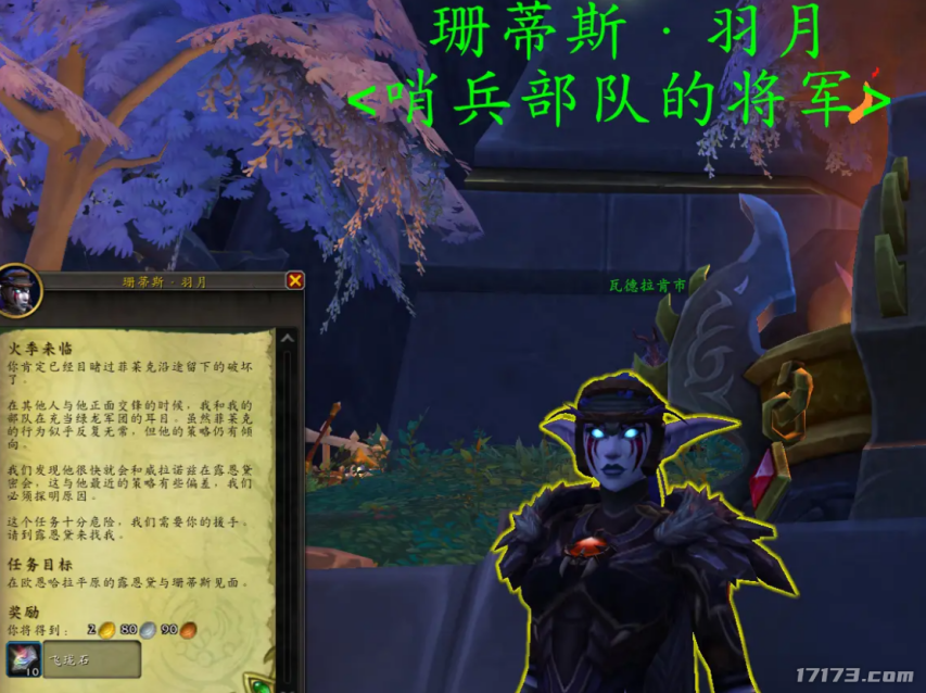 总之,在暗夜精灵打赢上古之战后,在暗夜精灵赢得上古之战后,珊蒂斯·羽月凭借赫赫战功和那么亿丢丢的人脉关系,被任命为泰兰德身边的哨兵队长。