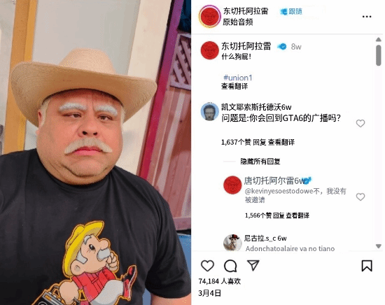 然而据Don Cheto本人在社交媒体上回复粉丝提问“是否会在新作中重返电台”时表示“我没有收到邀请。”而据外媒3djuegos分析,这位配音演员的缺席可能是因为《GTA6》彻底改变了城市风格,这意味着新作中将会出现新的文化、新的氛围,当然还有新的广播电台。