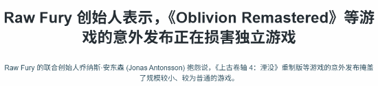4月底,《上古卷轴4:湮灭 重制版》的“突袭式”发售瞬间引爆全网。然而,对一些原本计划在同一天发布新作的独立游戏开发者而言,这无疑是一场“灾难”。