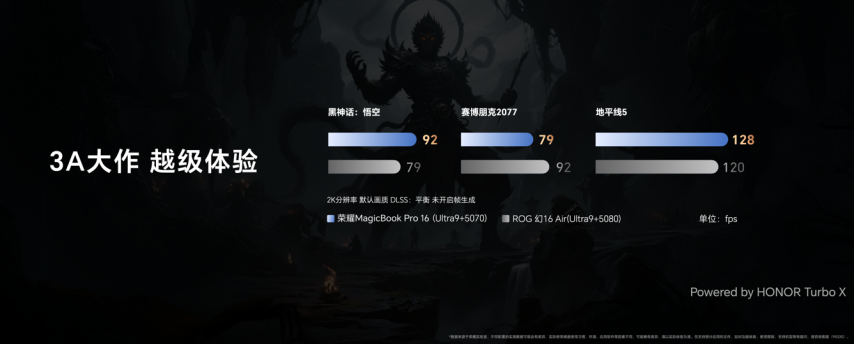 荣耀MagicBook Pro 16 HUNTER版2025拥有智能、高能、狂战三档性能模式可选,在狂战模式下,整机最高可释放150W超强性能。在HONOR Turbo X调校技术加持下,这款笔记本在不少主流3A和网游中实测的游戏帧率都达到行业领先水平,为用户带来更强大和流畅的越级体验。MagicBook Pro 16 HUNTER2025150WHONOR Turbo X3A