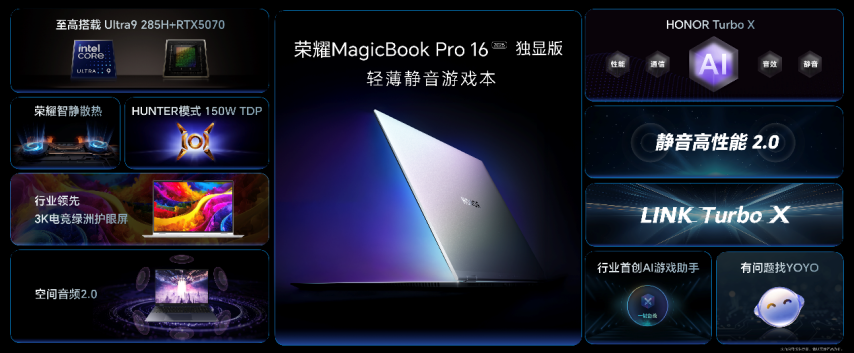 4月30日,荣耀MagicBook Pro 16 2025正式发布。作为笔记本性能旗舰Pro 16系列的全新迭代产品,荣耀MagicBook Pro 16 HUNTER版2025首发搭载RTX 5070显卡,在HONOR Turbo X加持下,带来性能、静音、画质、通信、音效等全面进阶体验,打造行业领先的轻薄静音游戏本。新品于4月30日15:30将开启全渠道首销,国补到手价5039.2元起。30MagicBook Pro 16 2025Pro 16MagicBook Pro 16 HUNTER2025RTX 5070HONOR Turbo X43015305039.2