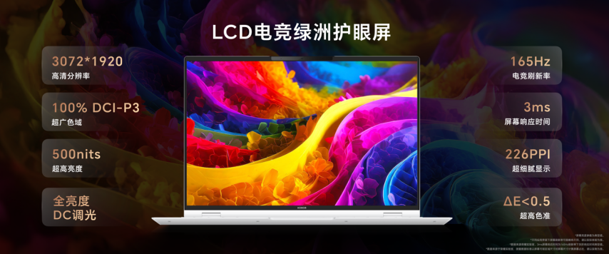屏幕上,荣耀MagicBook Pro 16 2025全系搭载3072*1920高分辨率的LCD屏,16:10屏幕比例,屏占比达到93%,拥有100% DCI-P3广色域,10.7 亿色深。屏幕亮度最高500尼特,刷新率165Hz,屏幕响应时间仅为3ms。支持行业最多的13种色彩模式,几乎涵盖99%的生产力场景。MagicBook Pro 16 20253072*1920LCD16:1093%100% DCI-P310.7 500165Hz3ms1399%