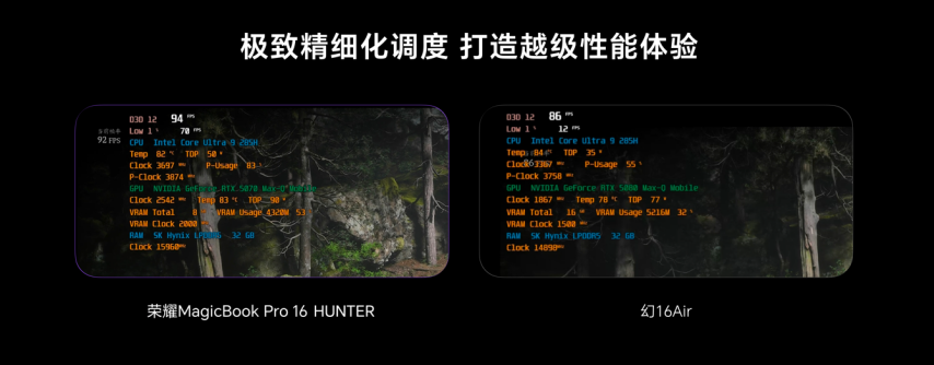 针对游戏本噪音大的痛点,去年荣耀MagicBook Pro 16首创静音高性能模式,引领了行业静音游戏本的风向。此次荣耀MagicBook Pro 16升级全新静音高性能模式2.0,实现了噪音更低的同时性能释放更出色。荣耀MagicBook Pro 16 HUNTER版 2025在静音高性能模式下,可以在35dB噪音下提供100W性能释放,同功耗下噪音表现相比同类产品下降14-16dB。MagicBook Pro 16MagicBook Pro 162.0MagicBook Pro 16 HUNTER 202535dB100W14-16dB