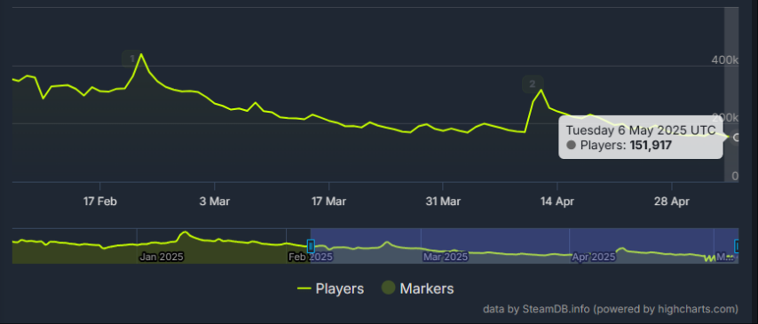 虽然这一数字在Steam平台已是很高的日活量,但与游戏发售一个月时六十四万人在线的峰值相比下降了约75%,可以说是“流失严重”。