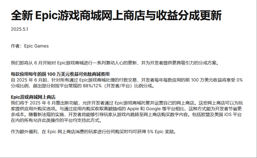 Epic Games在公告中表示,自2025年6月起,每个开发者每年每款应用的前100万美元收益将都不参与分成,超出部分则按平台常规的 88%/12%(开发者/平台)比例分成。