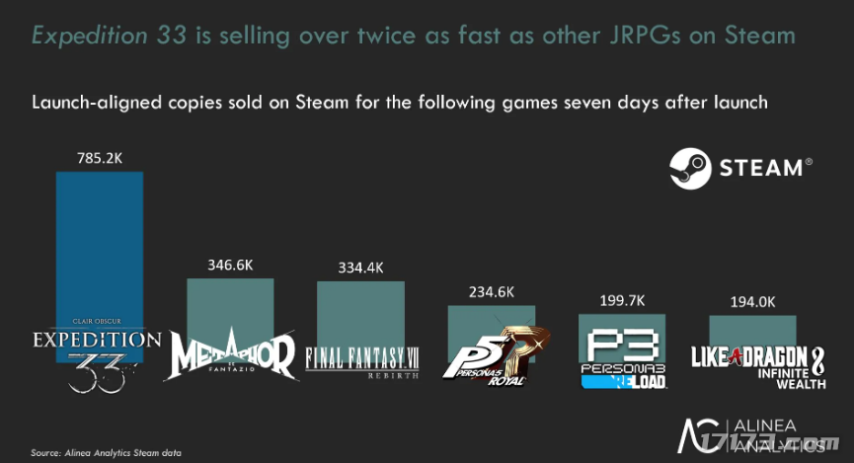 根据吃瓜不嫌事大的外媒统计,在首周销量这一块儿上面,《光与影:33号远征队》力压去年发售的一众大厂JRPG作品,是《最终幻想7:重生》的2.3倍,《女神异闻录5:皇家版》的3.34倍。
