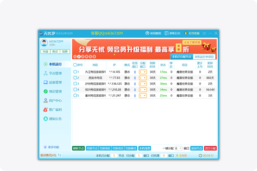 为解决用户ip限制的困扰,满足大家对于网络IP服务的多样化需求,经过技术团队夜以继日的努力与优化,无忧IP免费版正式发布上线!这一版本旨在为用户使用第三方代理产品时配合提供基础的IP线路导入服务,助力大家开启更便捷的游戏搬砖时代!免费版的上线,是我们为用户送上的一份诚意之作,我们希望通过这款产品帮助大家摆脱IP限制的束缚,在搬砖道路上走的更加轻松、高效。