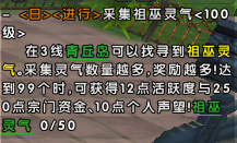 灵气分为祖巫灵气和浓烈的灵气,浓烈的灵气数量较少,但一次性获得的灵气较多。完成祖巫灵气之后返回江都城(256,249)苏妲己交任务,即可获得量宗门声望、宗门资金以及经验值。采集较多的玩家会在宗门里通报表扬哦,当然采集较少的玩家也会在宗门里通报批评。