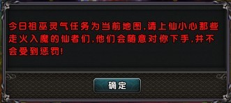 接取活动后,任务会提示玩家前往3线指定地图去采取祖巫灵气,采集时间为2小时,采取祖巫灵气的地图是PK地图,请诸位玩家格外小心。