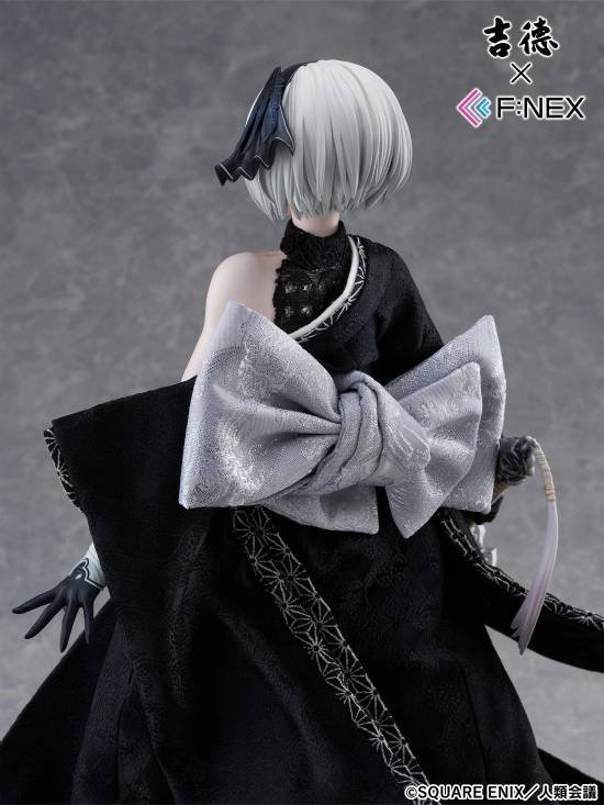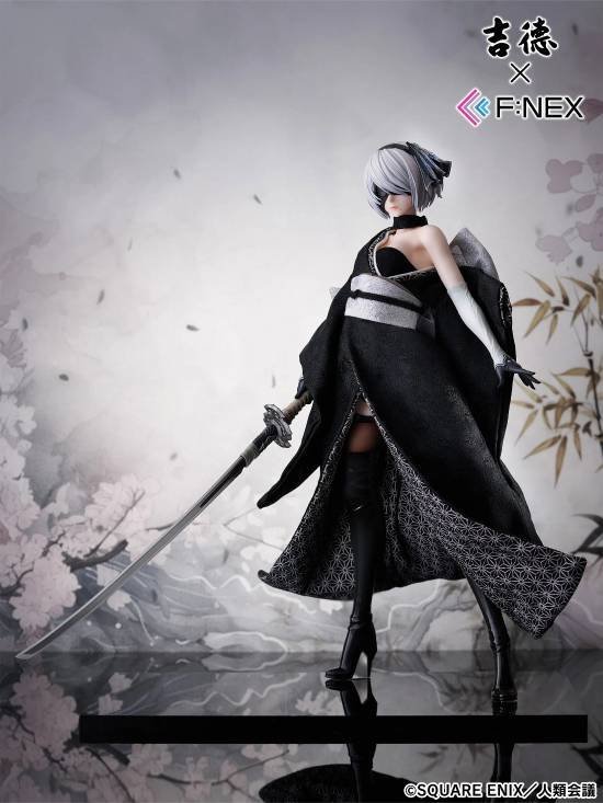 据悉,这款人形娃娃含底座高度约为43厘米,黑色的连衣裙被设计为类似襦袢(日本传统内衣)的风格,从靴子的光泽到手套的褶皱等细节都经过精心雕琢,堪称精品。整体以黑色为主色调,展现出冷酷而美丽的姿态,同时通过飘扬的裙摆和袖口的动态设计,既表现出力量感,又升华成了优雅的和服造型,让人充分感受到2B的魅力。