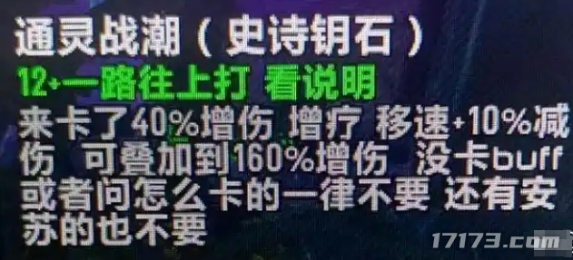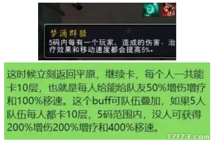 当时,有玩家发现能将《魔兽世界》的野外增伤BUFF梦涌群猎给带到副本里,使全队五个人一起获得高达200%增伤200%增疗以及400%移速BUFF加成,从而开启大秘境极速版,猛猛上分(Bu Shi)。