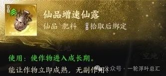 [增速仙露]能缩短成熟时间,以[铃兰]为例子,使用此仙露,成熟周期为600-600*67%=198分钟,3.3个小时,每12个小时约可收获[3~4次],铃兰的基础产量为[5个],即12个小时铃兰可收获[15~20个]。