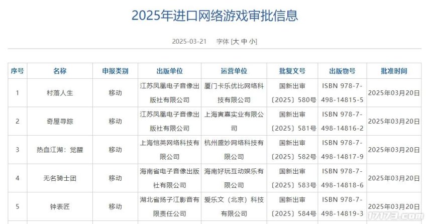 2025年3月21日,国家新闻出版署公布了3月国产网络游戏审批信息,129款游戏喜获版号,另外还有5款进口网络游戏过审,5款游戏审批变更信息。