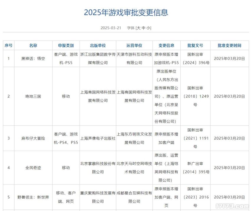 另外,3月21日还公布了5款进行了信息变更的游戏,其中《黑神话:悟空》增添了PS5版本,贪玩游戏的《野兽领主:新世界》增添客户端和网页版。
