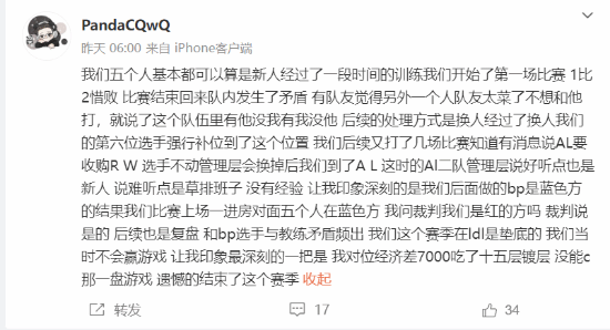 此外他还吐槽了AL二队刚刚组建时的“草台班子”事故。当时在后台讨论的BP策略是蓝色方的,结果上台后发现他们竟然是红色方!后续选手和教练也是矛盾频出,导致战队成绩垫底。“让我印象最深刻的一把是,我对位经济差7000吃了十五层镀层,结果没能c那一盘游戏,遗憾地结束了这个赛季。”