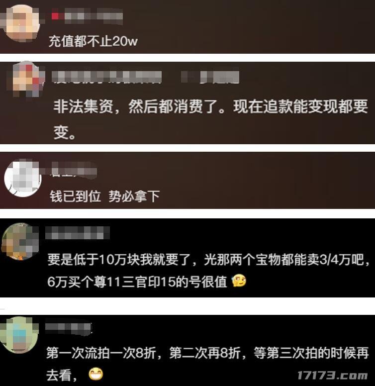 对于这次的拍卖,有网友吐槽,充值都不止20万。还有网友爆料账号被拍卖的原因是,这个玩家非法集资,现在是变现追赃款。
