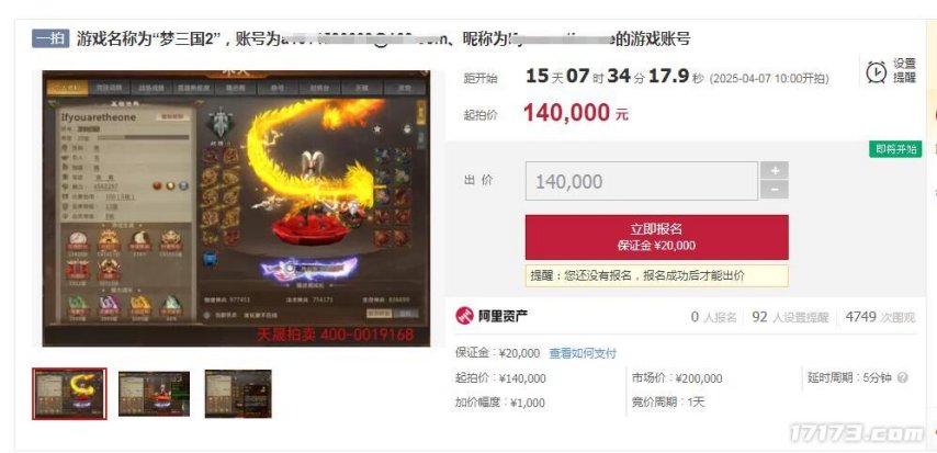 小弟嘠绿共:这个《梦三国2》的账号将于4月7日开拍,目前在拍卖平台上有4700多人围观,92人设置提醒,看来对这个账号垂涎三尺的玩家不少呀。小弟嘠绿共:这个《梦三国2》的账号将于4月7日开拍,目前在拍卖平台上有4700多人围观,92人设置提醒,看来对这个账号垂涎三尺的玩家不少呀。
