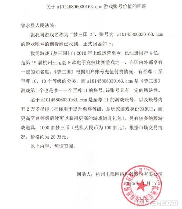法院曾向《梦三国2》的运营商电魂网络要求鉴定这个账号的价值,电魂网络在回信中没有说这个账号为什么能突破等级上限,达到11级,只是表示 ,该账号是《梦三国》游戏第一个也是唯一一个最高等级账号。