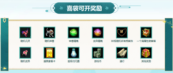 除了自选礼包的自由搭配外,喜袋也是本次活动中的一大亮点。喜袋中藏有丰富的奖励,包括随机元灵(元灵种类包括赤天、混沌、笛舞、降魔、夫诸、震魃等)、随机神兽、变异、神兽精魄、变异精魄、满属性装备箱、80级随机所有相首饰、道具套餐卡、商城道具、道行、游戏币等。但本月从喜袋中获得的道行奖励达到500次上限后,再使用喜袋开出道行奖励时将自动转换为经验奖励。随机元灵(元灵种类包括赤天、混沌、笛舞、降魔、夫诸、震魃等)80500