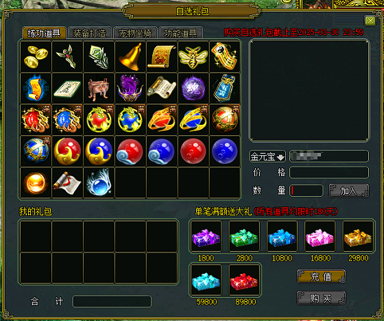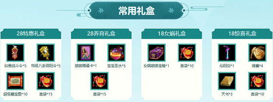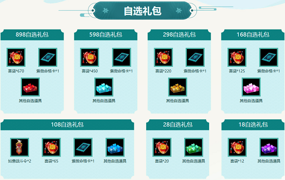 玩家可以根据自己的游戏需求,选择自选礼包商城里的物品,自由搭配同种类的道具,只要所选道具的价值满足相应“自选礼包类型”的要求,当价格达到1800元宝、2800元宝、10800元宝等不同档次时,就可以将所选道具打包成相应的礼包,并且还能获得免费赠予的其他相应道具。“”1800280010800